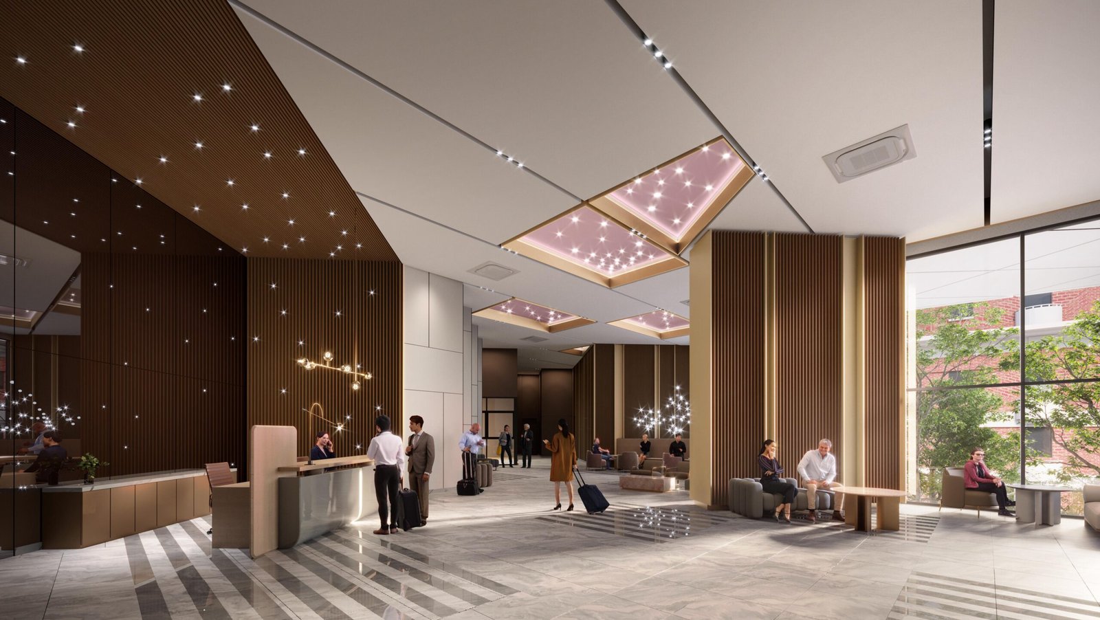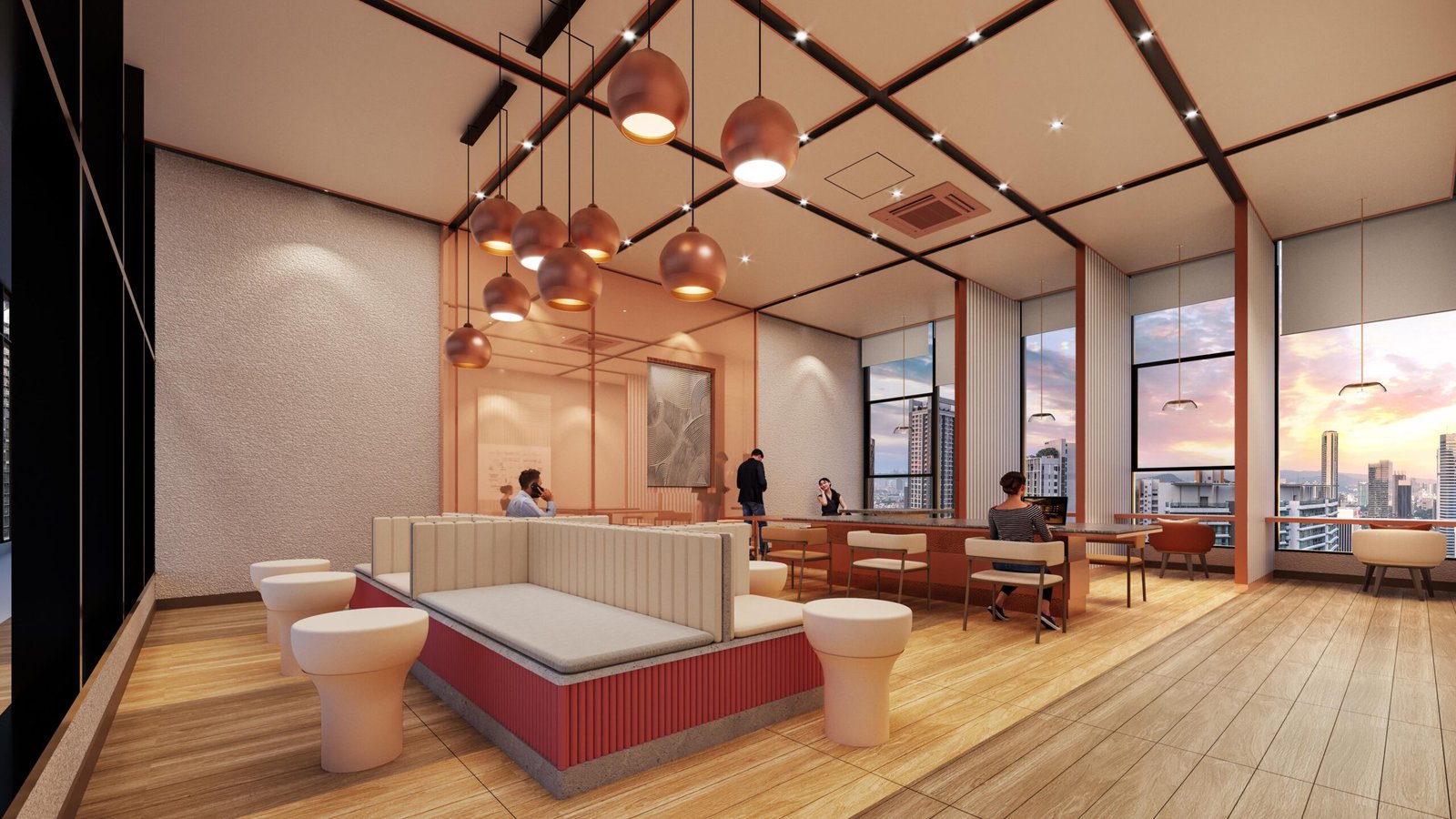 Infinity pool, gym, jacuzzi, lounge areas, and co-working spaces at elevated floors.